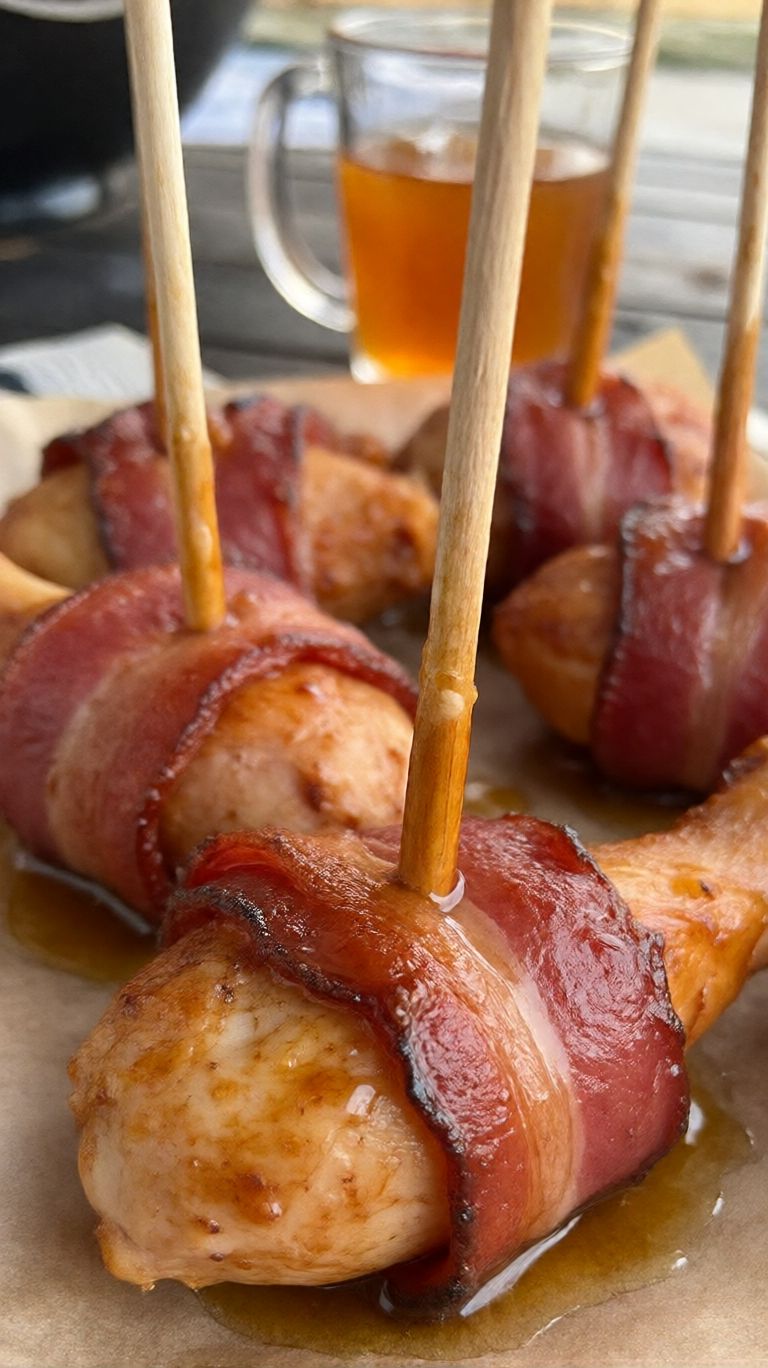 Smoked Bacon-Wrapped Chicken Lollipops with Honey Sriracha Glaze